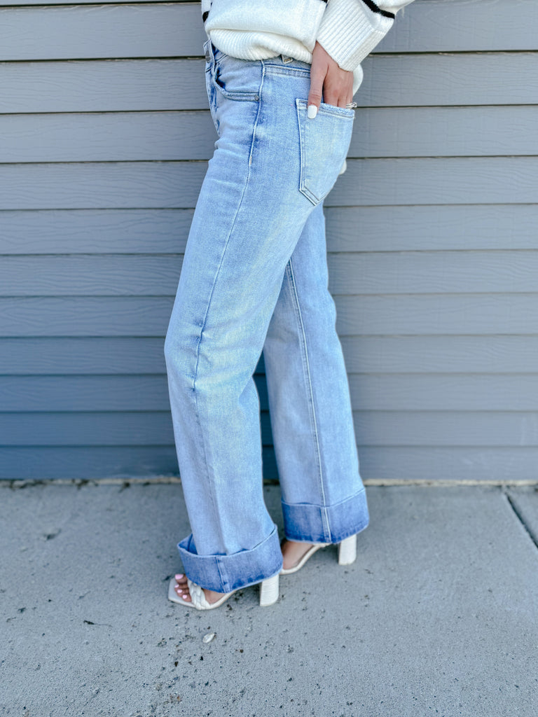 High Rise Ankle Wide Cuffed Jeans