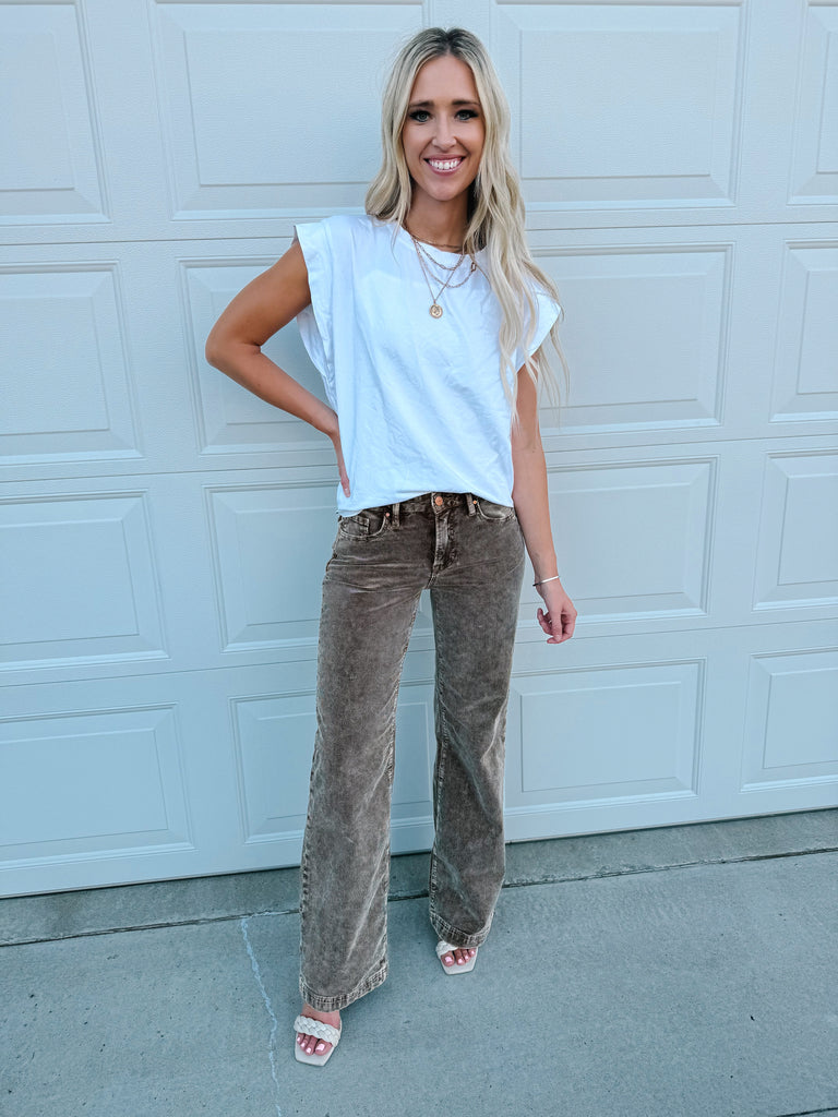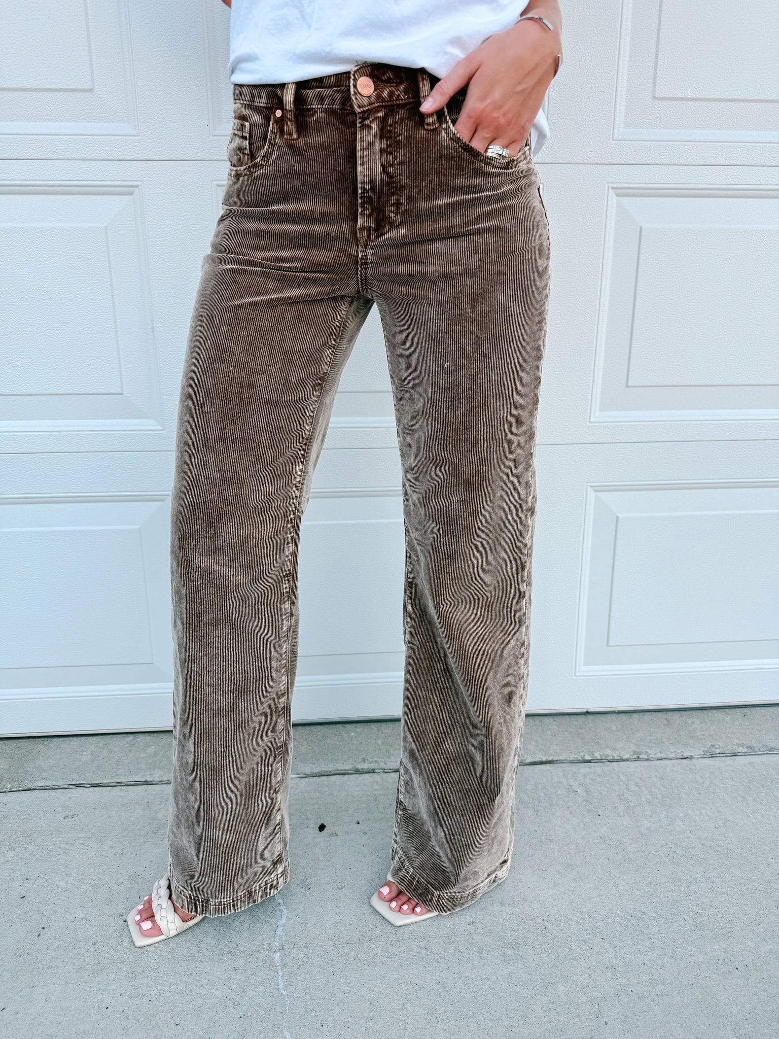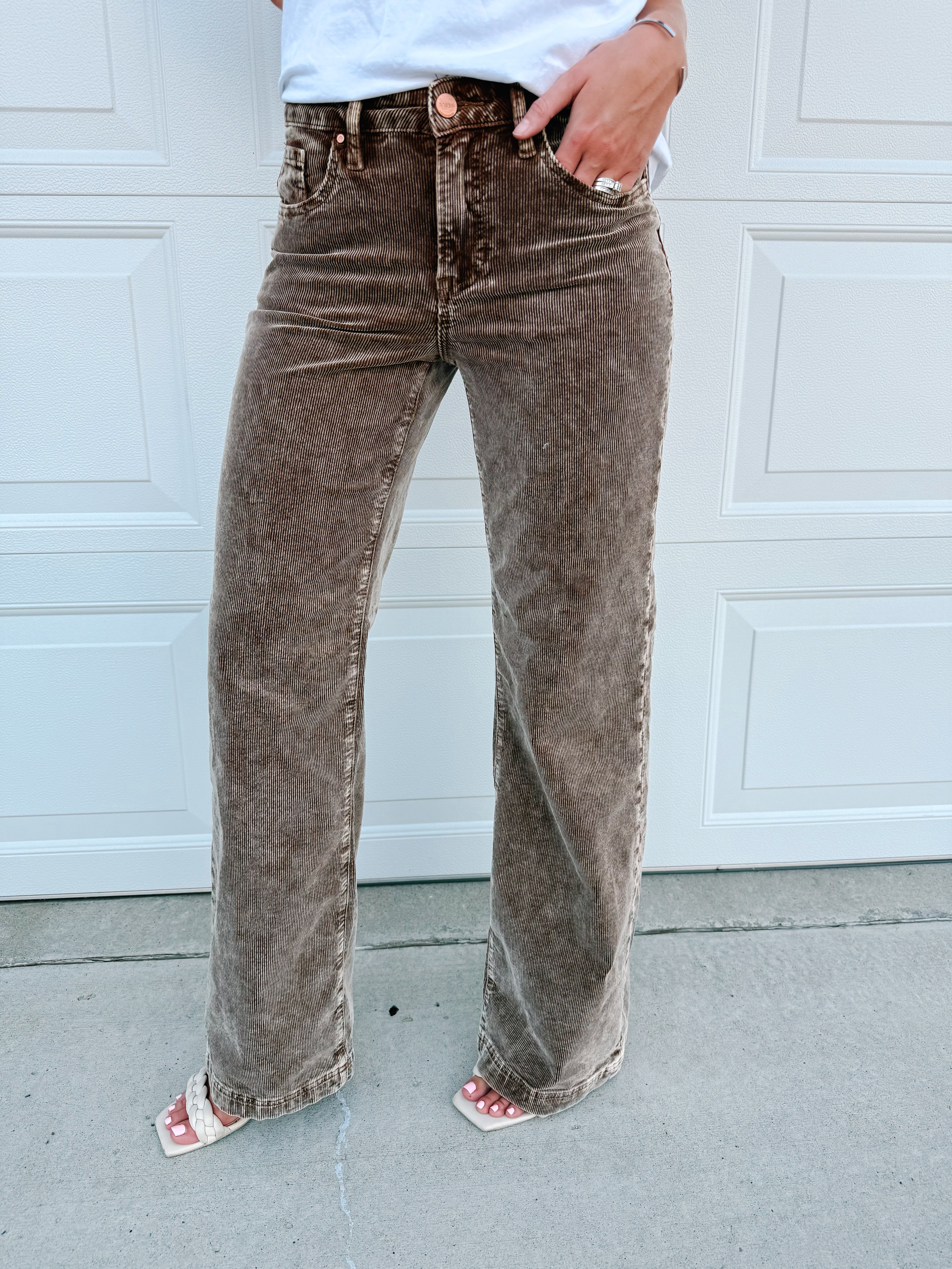 These high-rise corduroy jeans feature a wide-leg design for a trendy and stylish look. The high-rise waist offers a flattering fit and elongates the legs, creating a sleek silhouette. The corduroy fabric adds texture and warmth, making these jeans a versatile and cozy option for the cooler months. The wide-leg cut adds a fashionable and retro-inspired touch to any outfit. Elevate your denim collection with these High Rise Wide Leg Corduroy Jeans for a chic and on-trend ensemble.