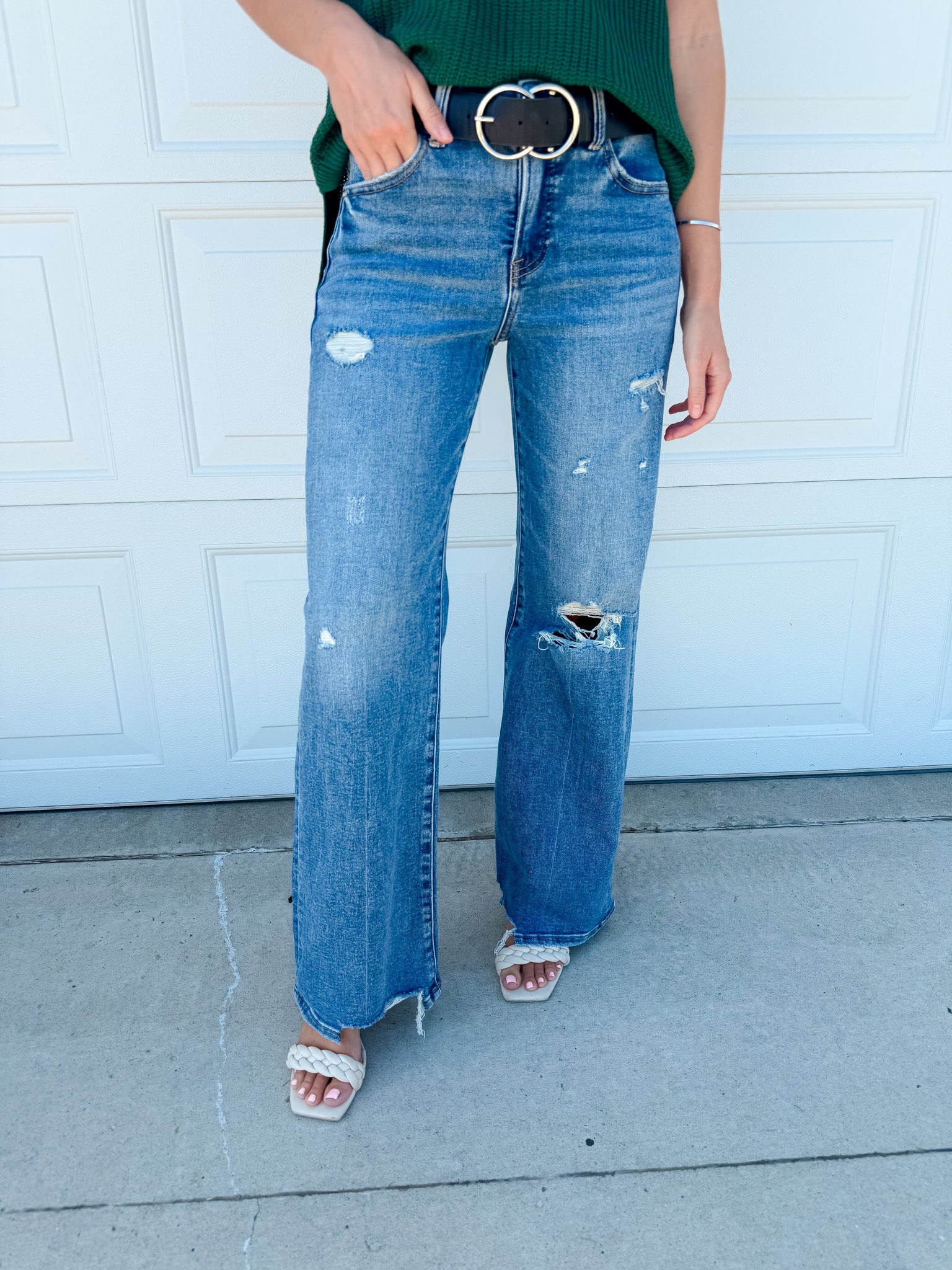 These fashion wide leg jeans feature a high-waisted silhouette that flatters your figure while providing comfort and style. Crafted from premium denim fabric with stretch for all-day wearability, these jeans showcase authentic distressed details including strategic rips at the knee and faded wash treatment. The relaxed wide leg cut creates a flowing, effortless look perfect for casual outings or dressed-up occasions. The classic five-pocket construction and button-fly closure add traditional denim appeal, while the raw hem finish gives a modern edge. Perfect for pairing with crop tops, fitted tees, or blouses for versatile styling options.