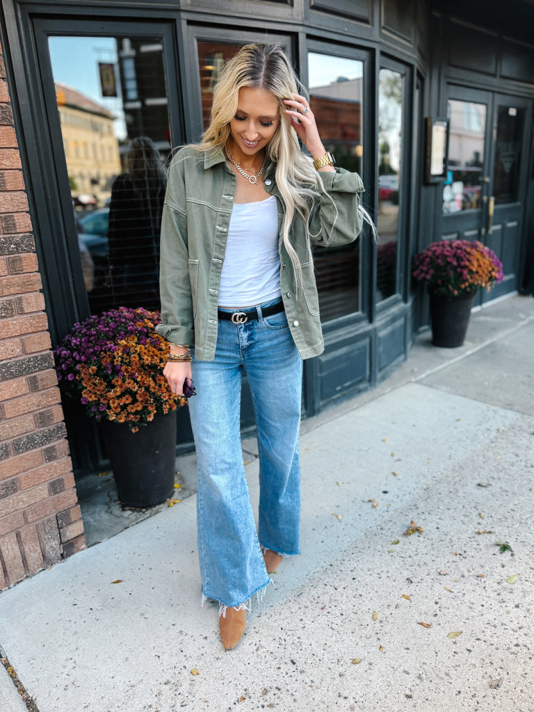 Oversized Cargo Pocket Denim Jacket with Cuffed Sleeves