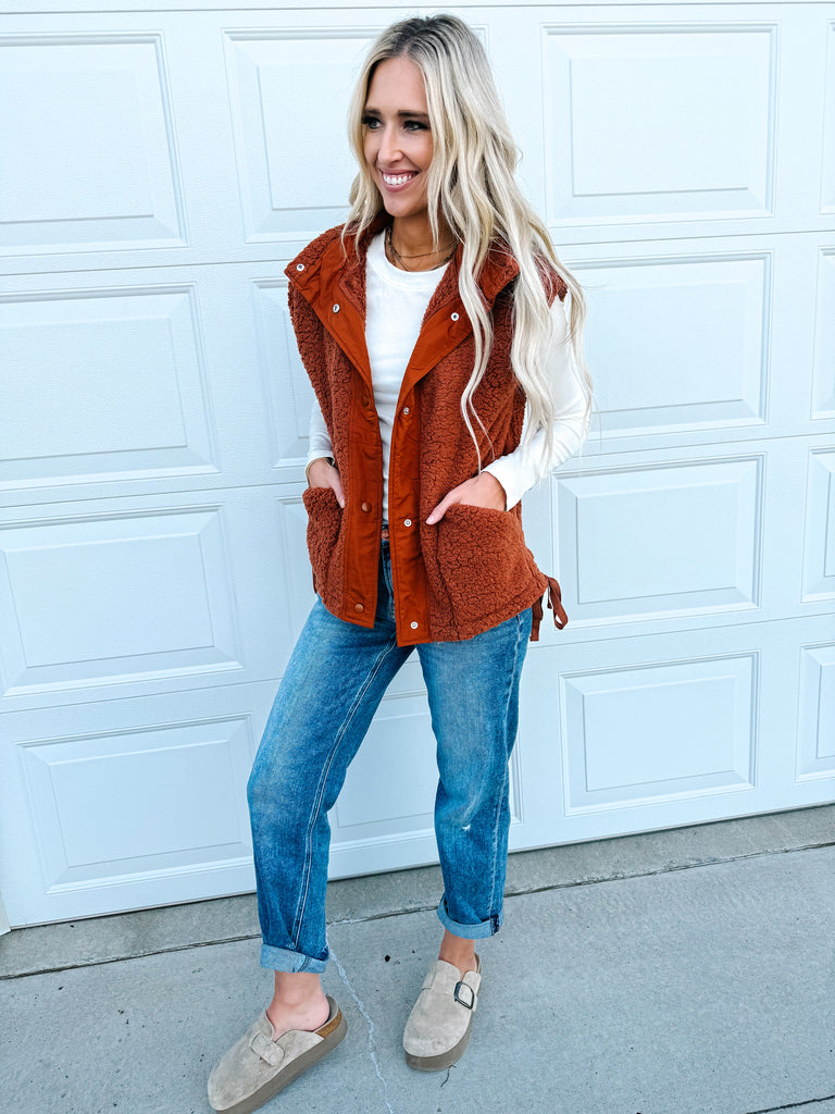 Cinnamon Faux Fur Snap Button Front Knot Side Plush Vest