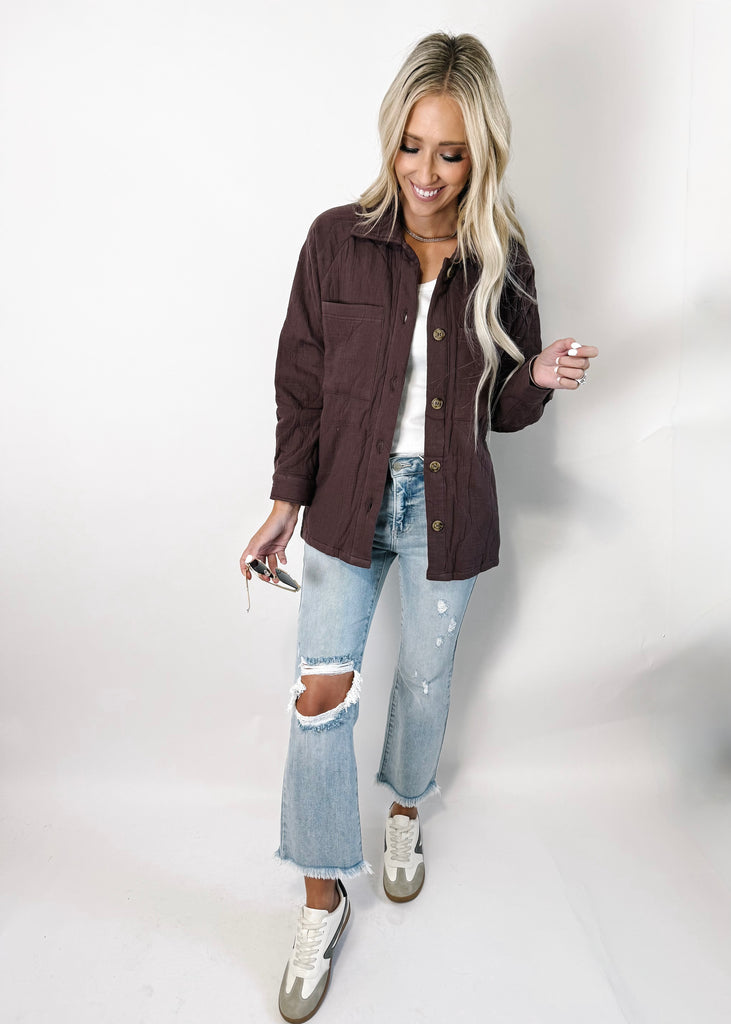 The Quilted Wrinkle Gauze Long Sleeve Shacket is a versatile and trendy piece that combines the style of a shirt and jacket. The quilted design adds texture and warmth to this lightweight gauze fabric. Perfect for layering and adding a stylish touch to your outfit, this shacket is both practical and fashionable. Embrace the chic and relaxed vibe of this quilted wrinkle gauze long sleeve shacket for a casual yet sophisticated look.