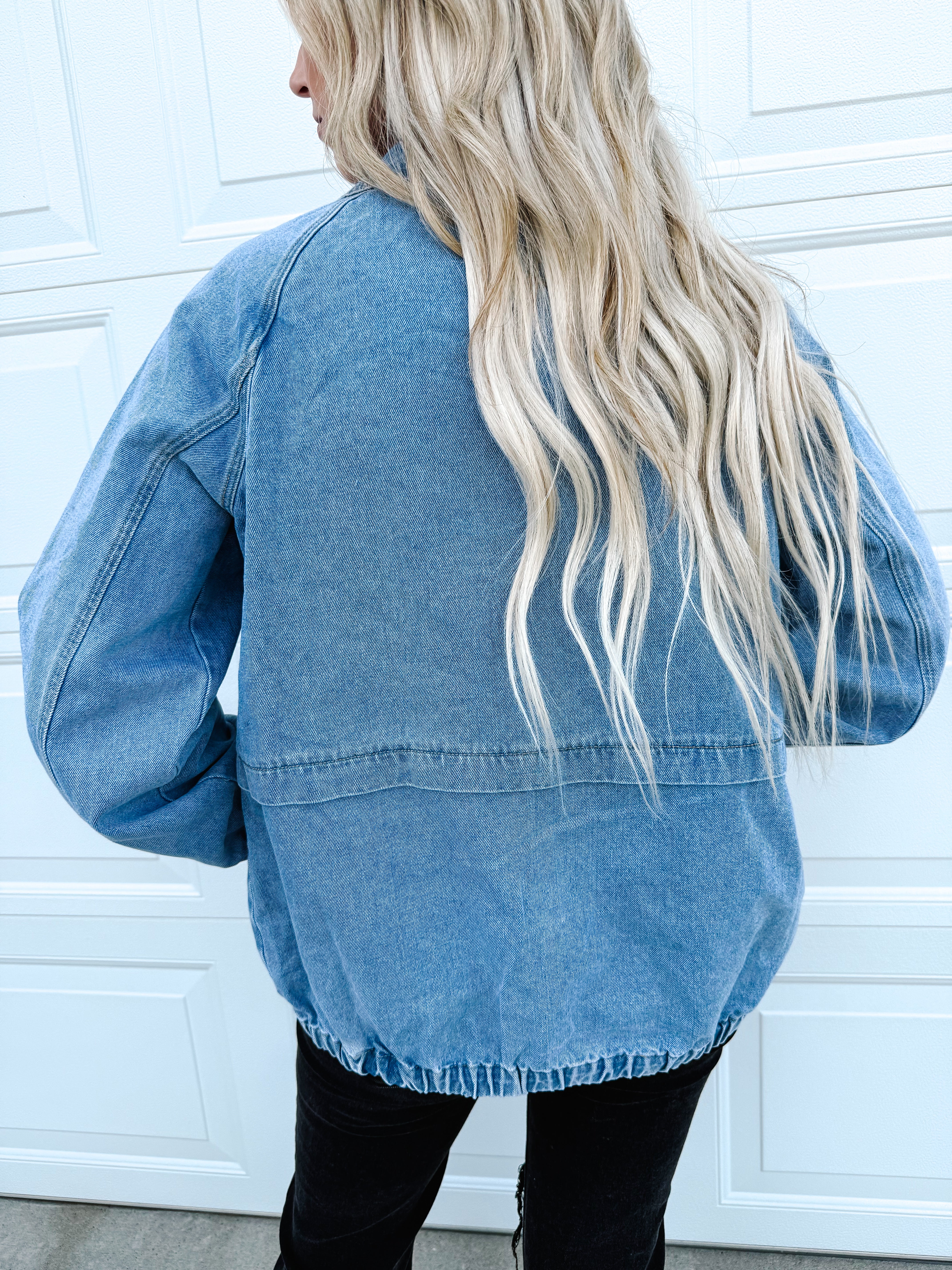 Myosotis Elastic Hem Collared Zip Up Denim Jacket