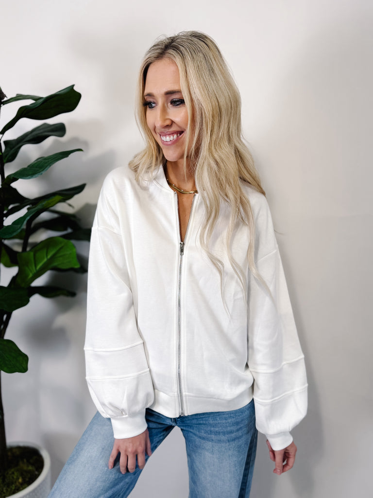 - Elegant white jacket with a modern zip-up design for a sophisticated look.