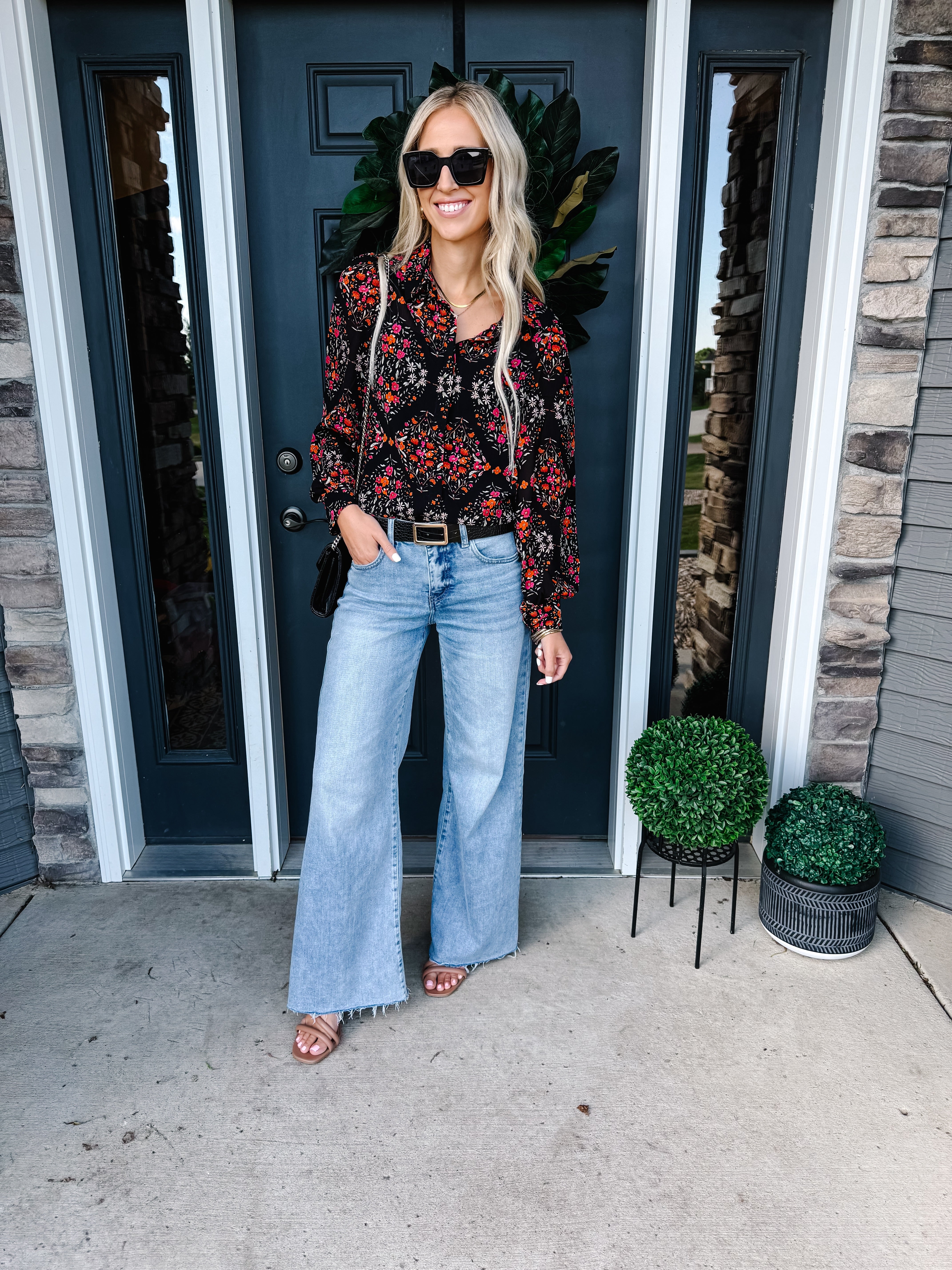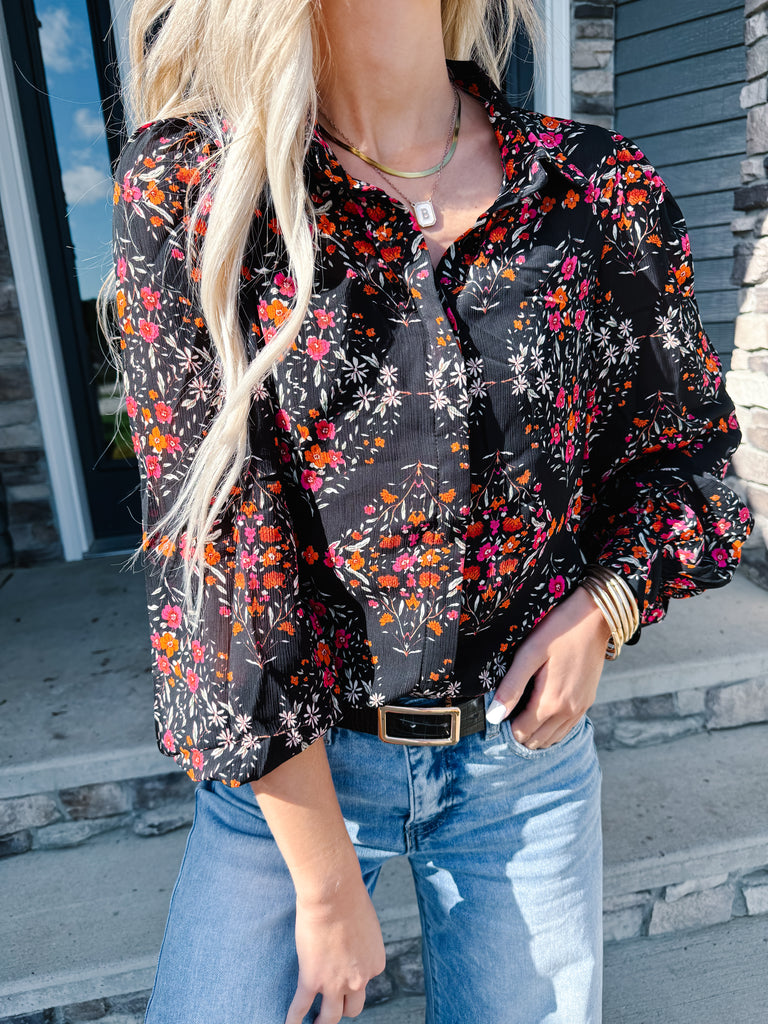 Black Floral Print Collared Button Up Puff Sleeve Shirt