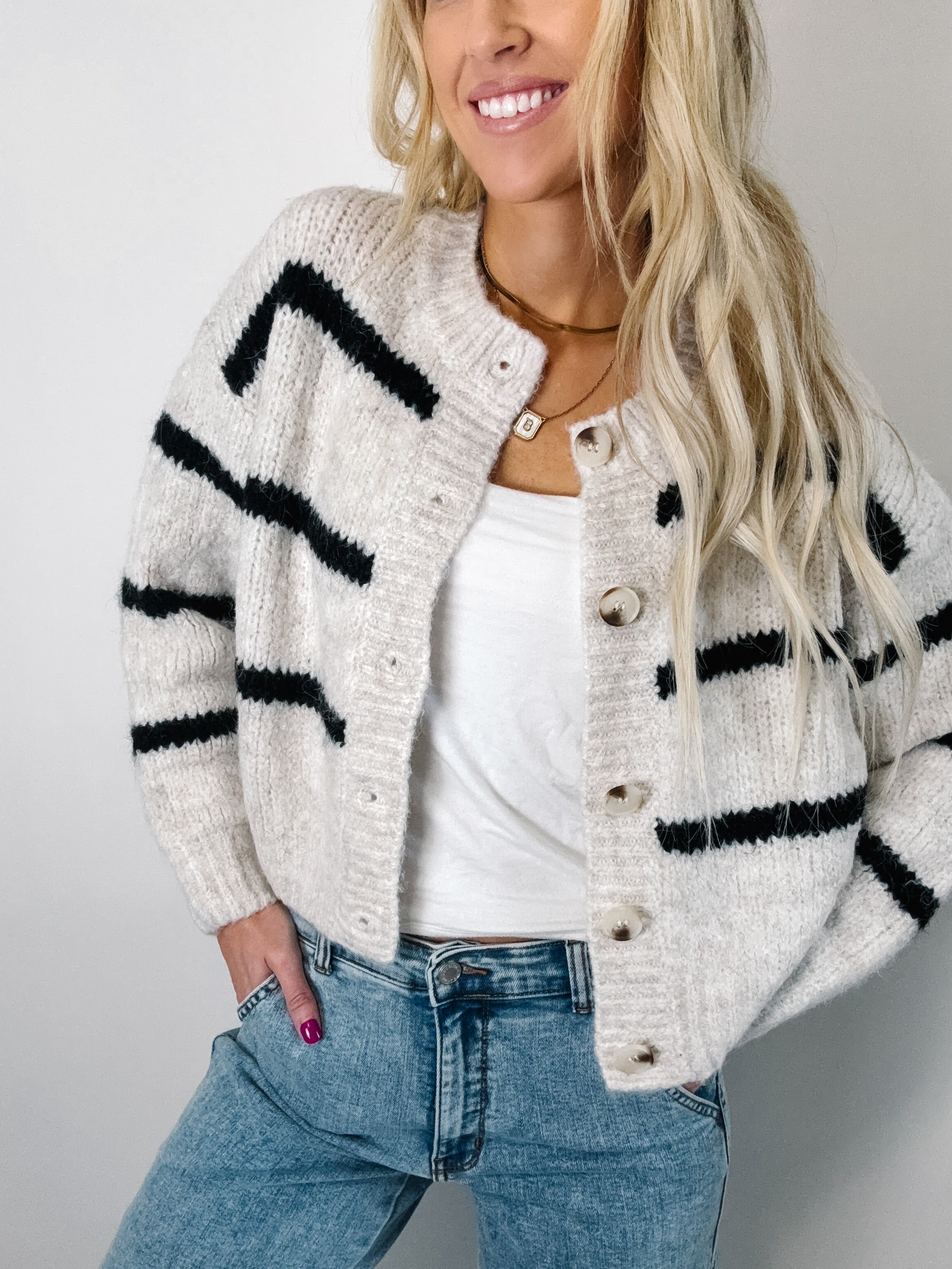 This stripe soft touch button cozy sweater cardigan is a must-have layering piece for your wardrobe.