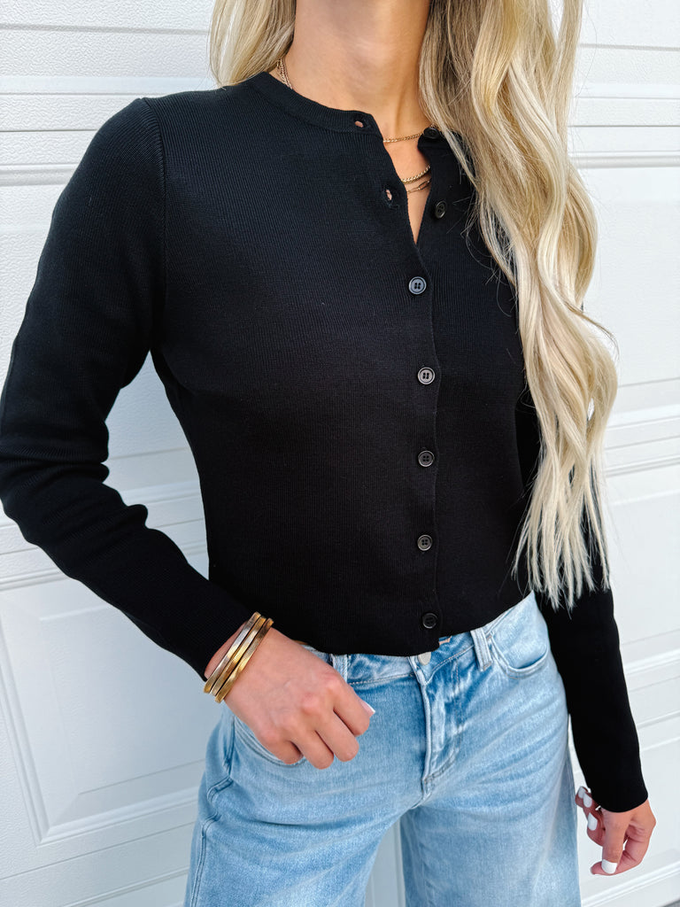 Button-Front Crewneck Long Sleeve Cropped Cardigan