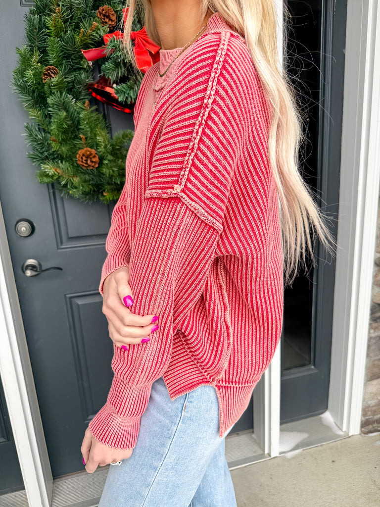 This cozy ribbed pullover sweater features a classic turtleneck design crafted from soft knit ribbed material. The oversized texture adds visual interest and stretch. Available in a rich burgundy red color, this versatile sweater is perfect for casual everyday wear, layering, and staying warm in cooler weather. Long sleeves with ribbed cuffs and classic pullover contrast.
