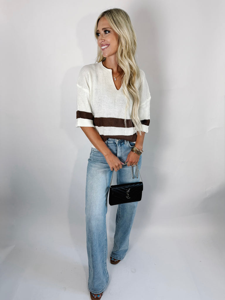 Khaki Checkered Color Block Crew Neck Short Sleeve Sweater