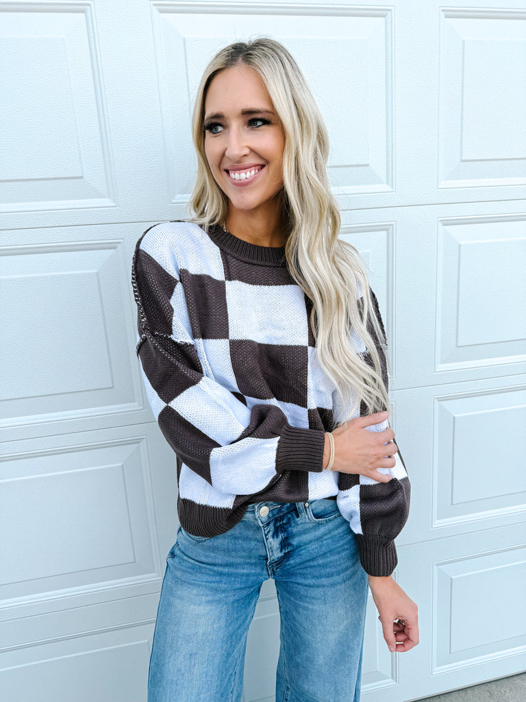 Dark Brown Plaid Bishop Sleeve Pullover Sweater
