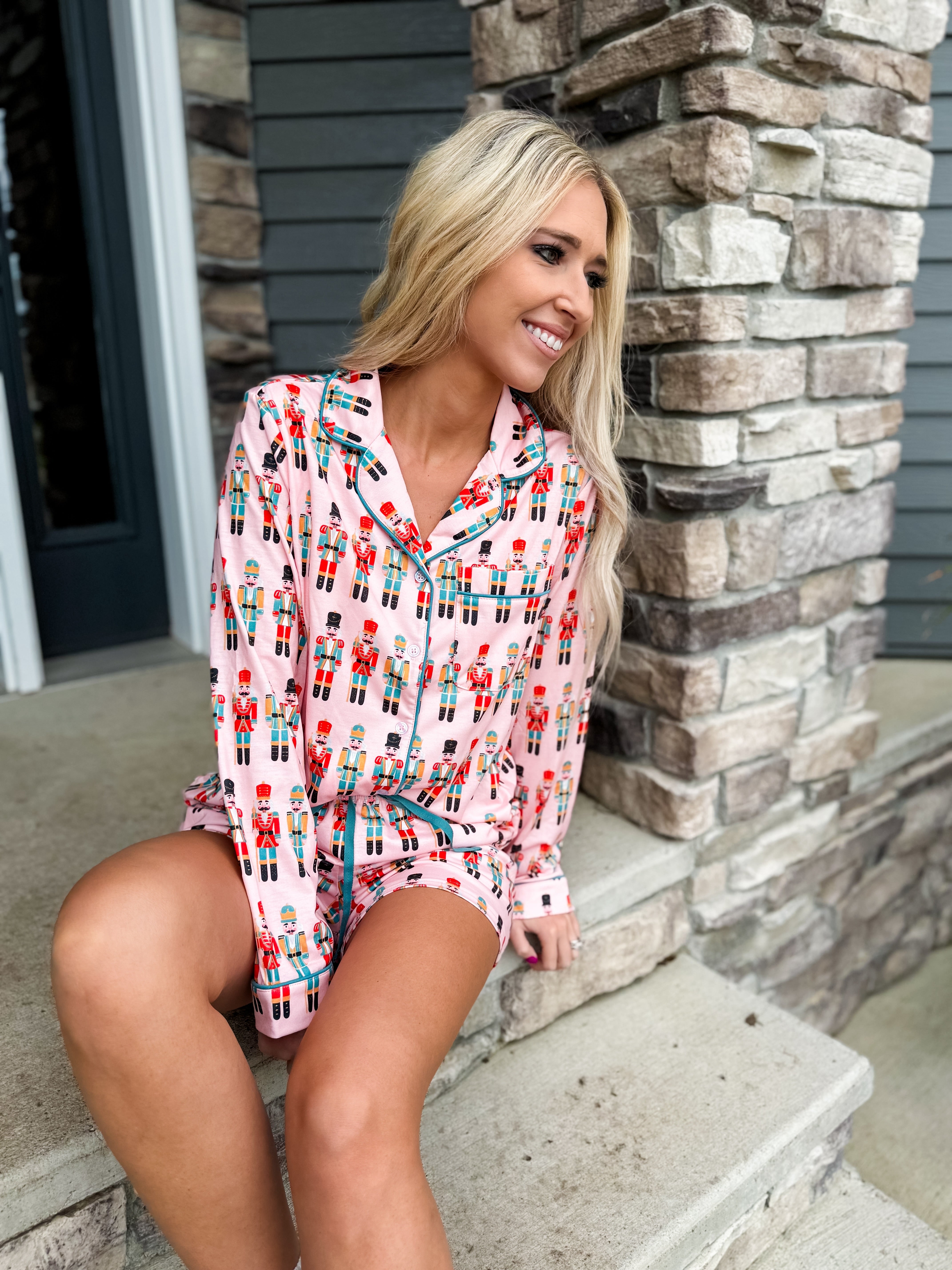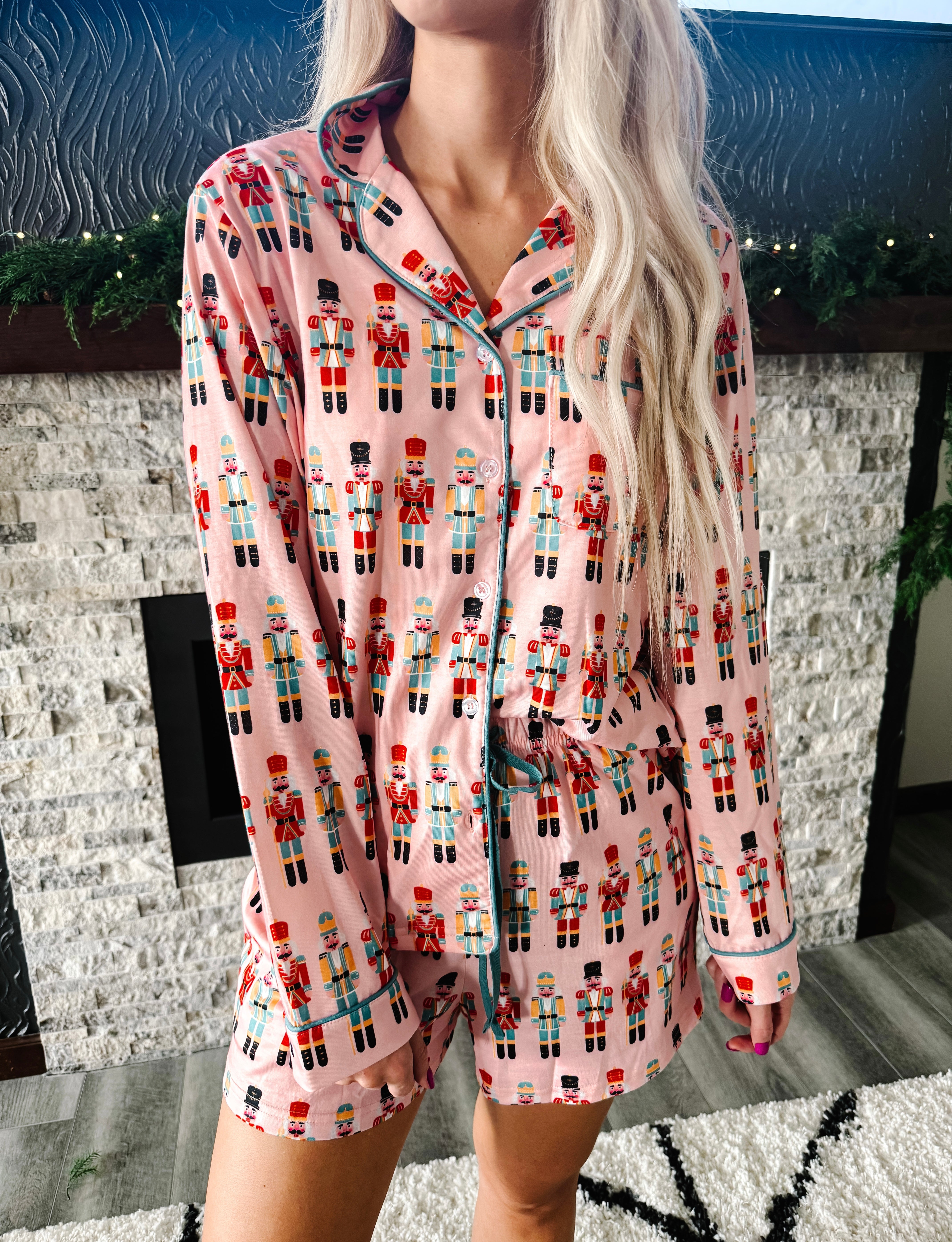 - Pink Nutcracker patterned 2-Piece pajama set. Keeping the holidays stylish and comfy with this loungewear set!