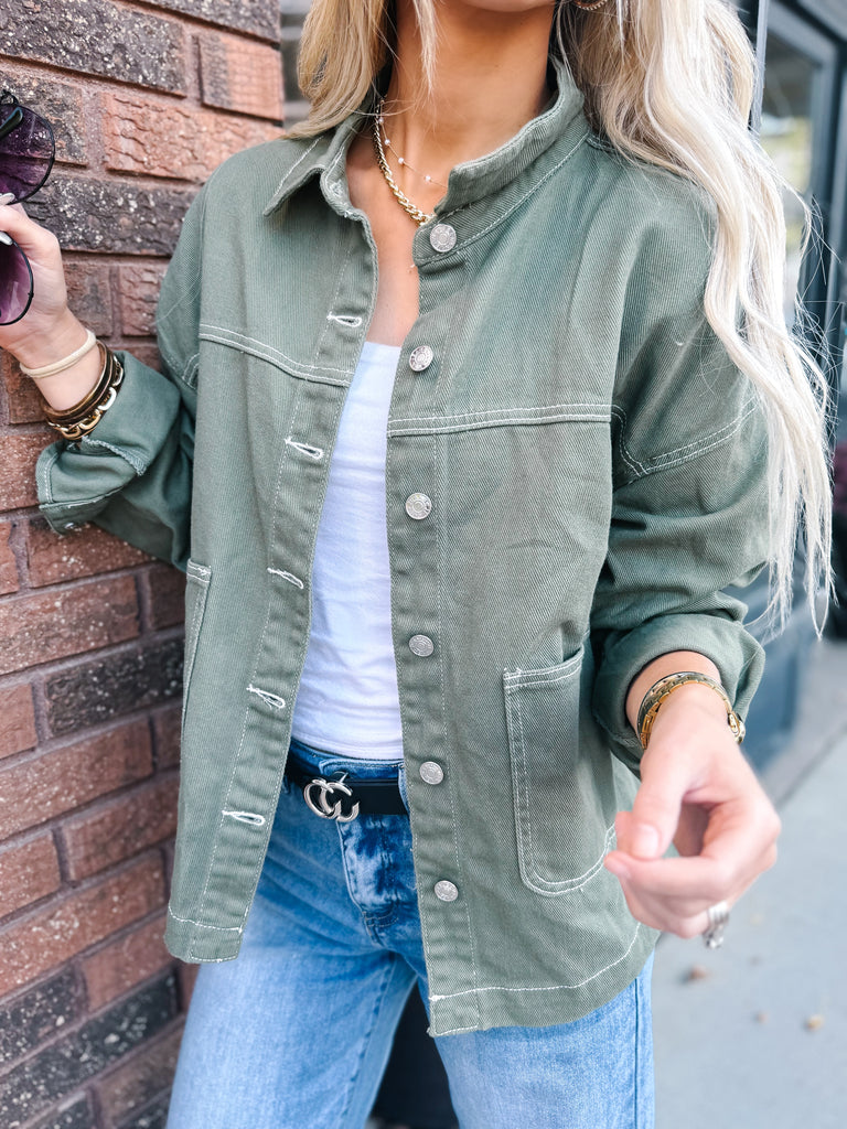 - Elevate your casual look with this denim jacket, featuring a stylish solid color that adds a touch of sophistication to any outfit.