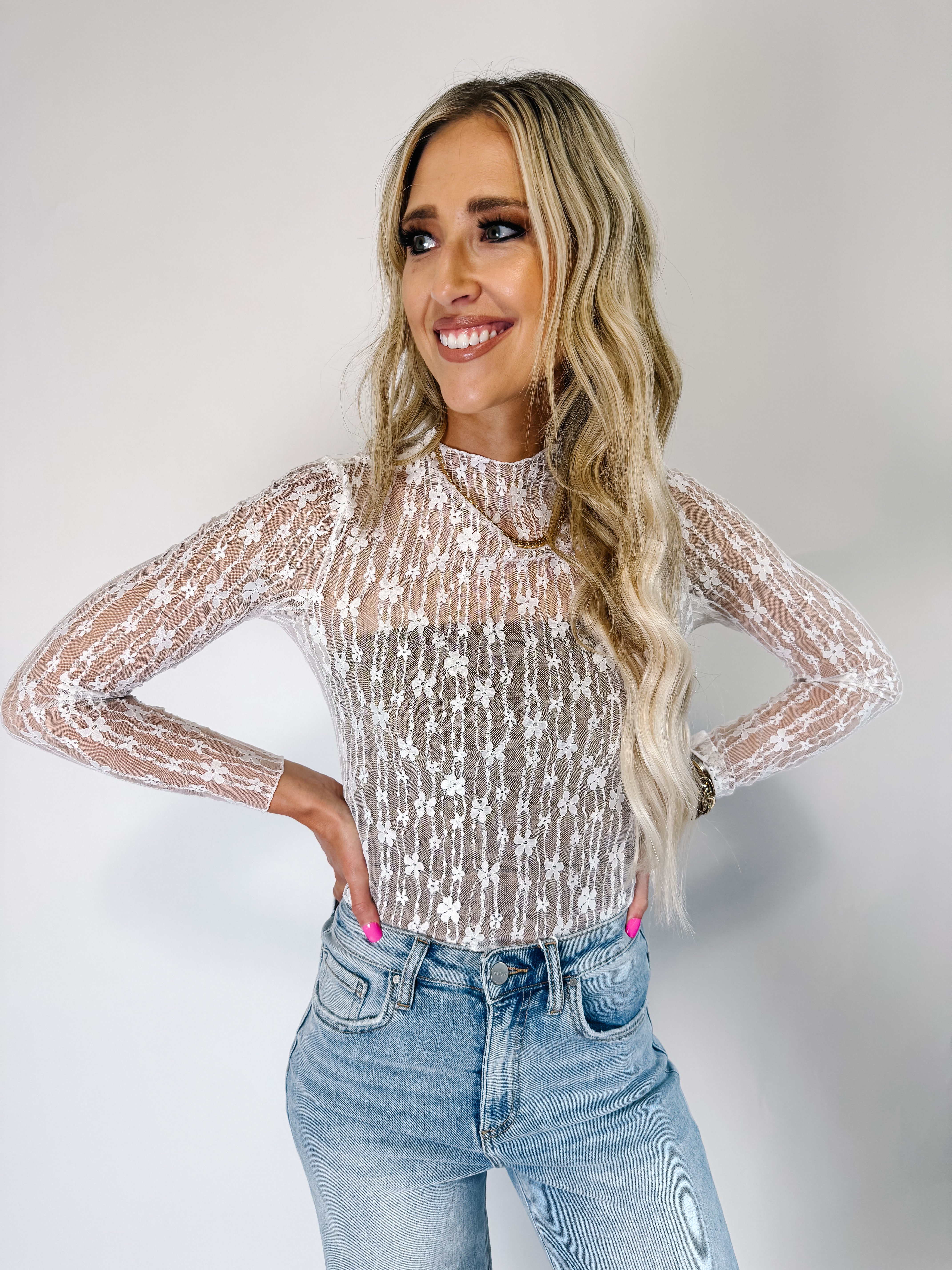 White Sheer Floral Lace Long Sleeve Slim Fit Top